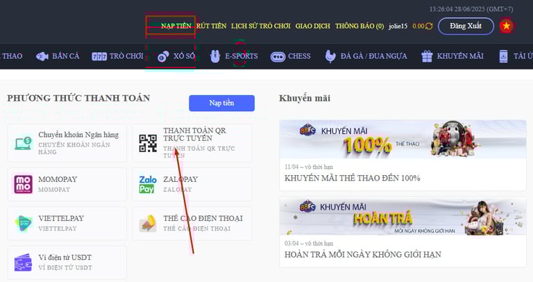 BƯỚC 3 : Bạn hãy vào phần nạp tiền 88FC và chọn thanh toán trực tuyến
